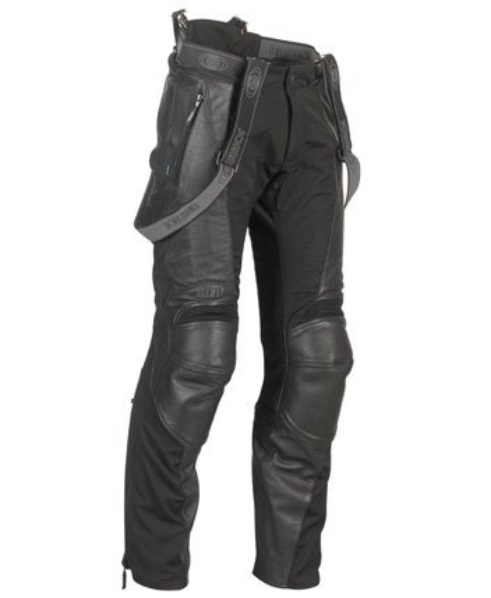 -Spodnie z koźlej skóry i tkaniny typu cordura.-100% wodoszczelna i oddychająca membrana DRYWAY-wstawki elastyczne w pasie i nad kolanami-na biodrach i kolanach z atestem CE-potrójne szwy-mogą być spinane z kurtką-szeli w komplecie ...